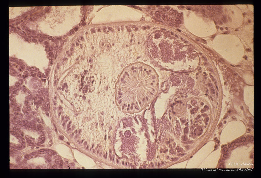 Mesocercarial stage in the adipose tissue of a mouse mammary gland. Note the large, unicellular penetration glands. Low and high magnifications.
