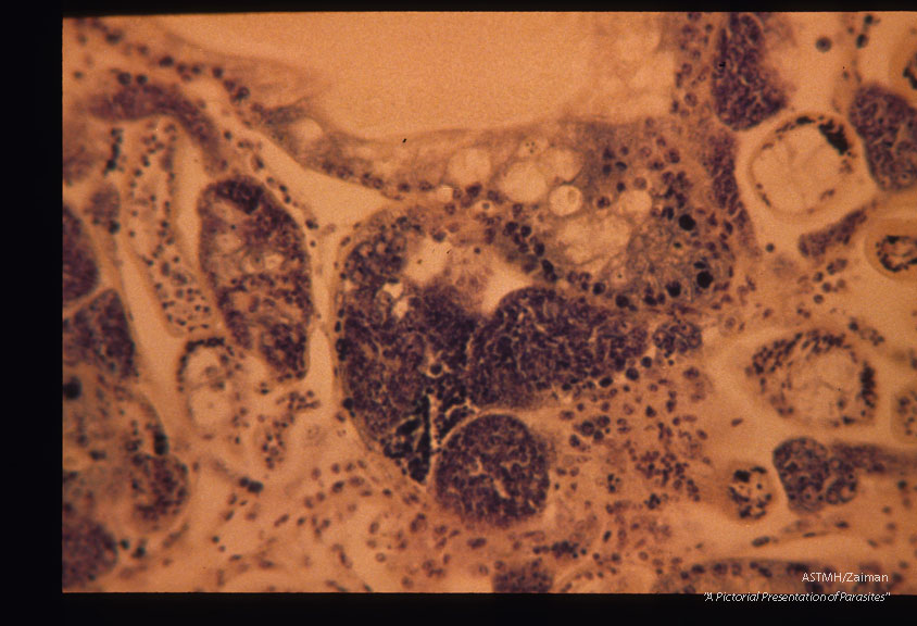 Description: Sections through snail (Biomphalaria glabrata) liver containing sporocysts 54 days after infection.
