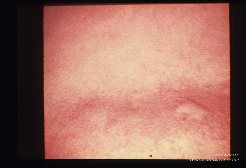 Description: Linear, migrating, urticarial, pruritic rash on abdomen of patient suffering chronic infection.