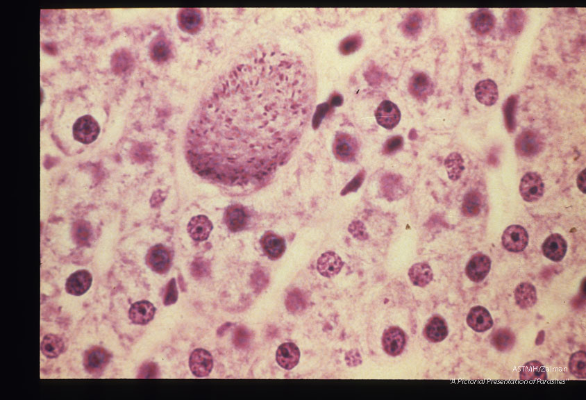 Description: Demonstration of hypnozoiite and hepatic schizonts by immunof lucres cent antibodies and subsequent counterstaining by Giemaa-colophonium.