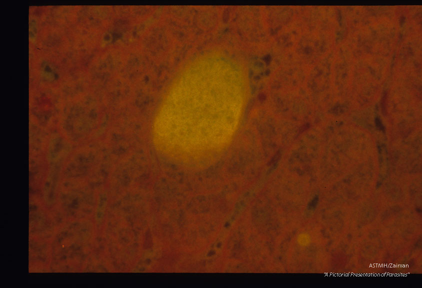 Description: Demonstration of hypnozoiite and hepatic schizonts by immunof lucres cent antibodies and subsequent counterstaining by Giemaa-colophonium.