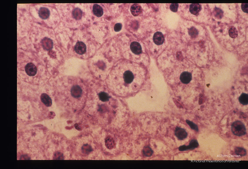 Description: Demonstration of hypnozoiite and hepatic schizonts by immunof lucres cent antibodies and subsequent counterstaining by Giemaa-colophonium.