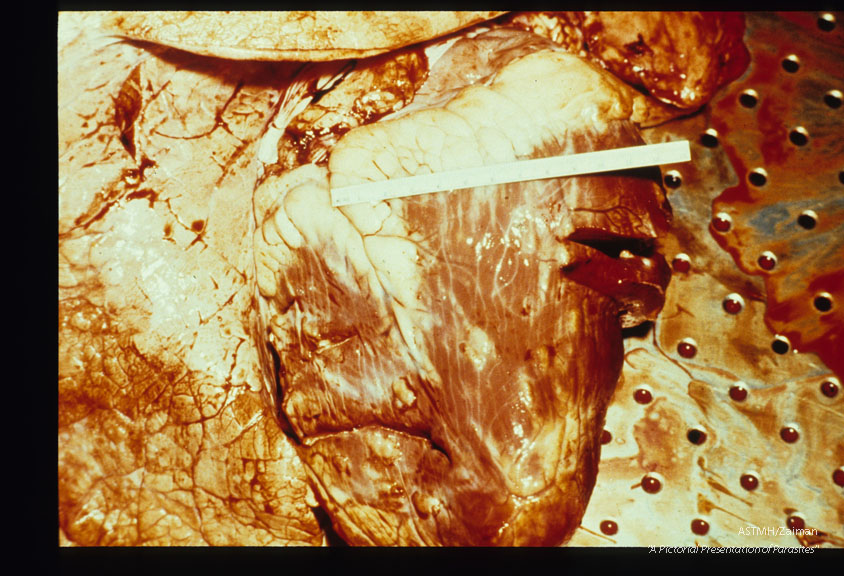 Description: Beef heart harboring multiple cysticerci. Gross specimen.
