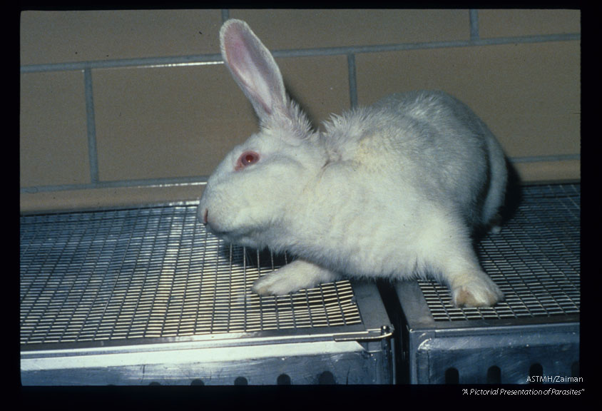 Description: Experimentally infected rabbit suffering loss of equilibrium, ataxia and torticollis.