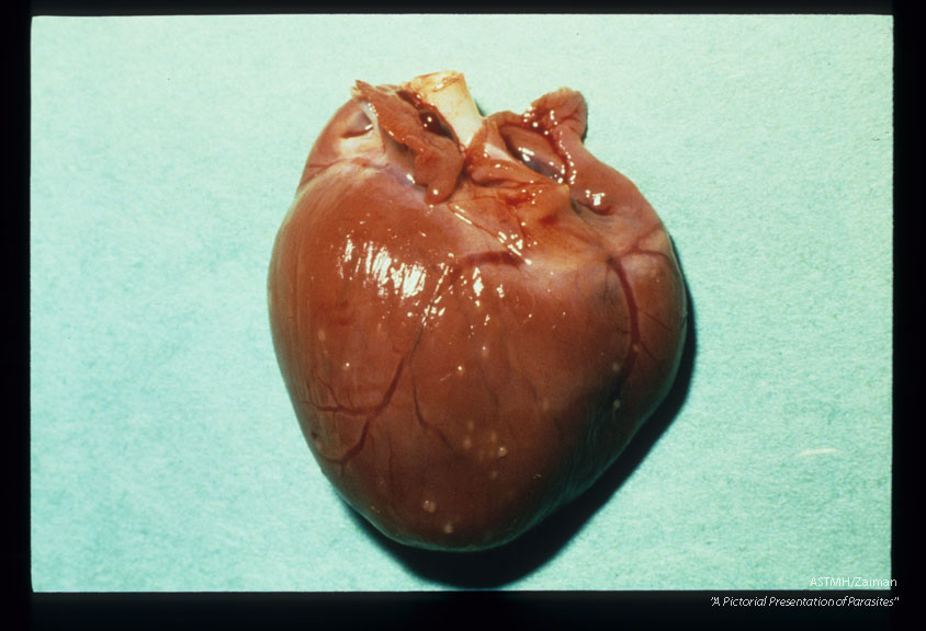 Description: Myocardial and epicardial granulomas in an experimentally infected woodchuck.
