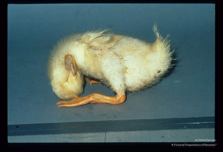 Description: Experimentally infected duck suffering encephalitis with severe torticollis.