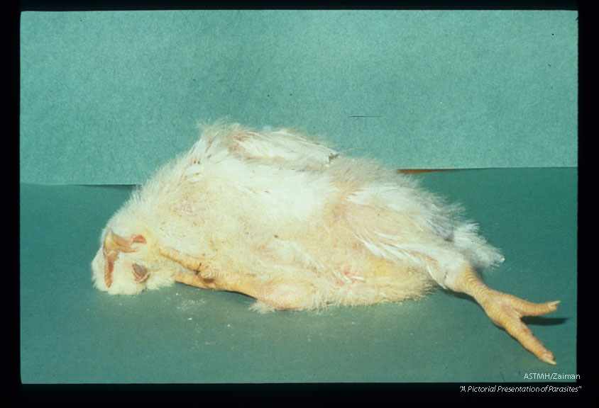 Description: Experimentally infected chicken suffering encephalitis, with extensor rigidity and torticollis.