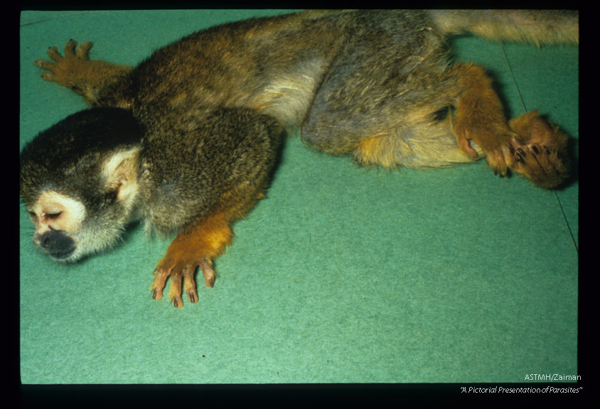 Description: Comatose experimentally infected squirrel monkey who suffered severe encephalitis with narcolepsy.