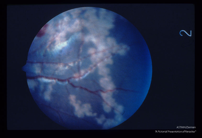 Description: Fundus of a cynomolgus monkey showing inflammatory migratory tracks, sheathing of vessels, and focal hemorrhage 8 days after experimental infection.