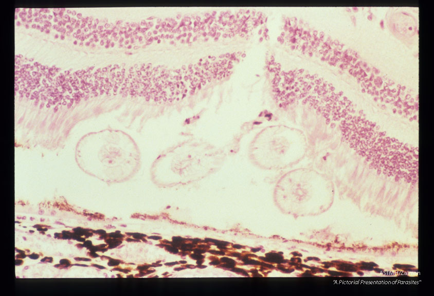 Subretinal larva and outer nuclear layer pyknosis in an experimentally infected cynomolgus monkey.