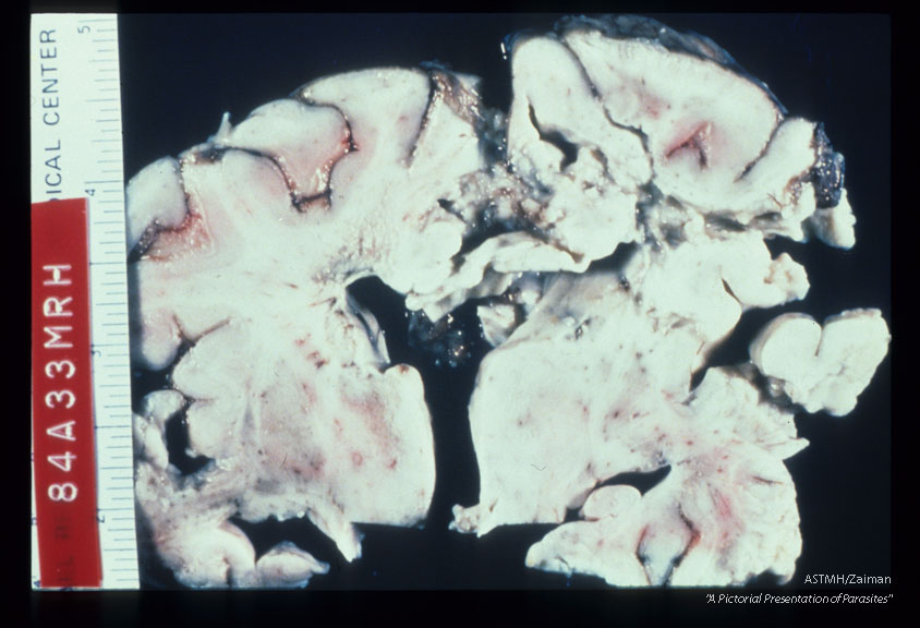 Description: A one and one half year old boy died after a 3 week bout of CNS disease. Brain shows peri-ventricular necrosis and softening.