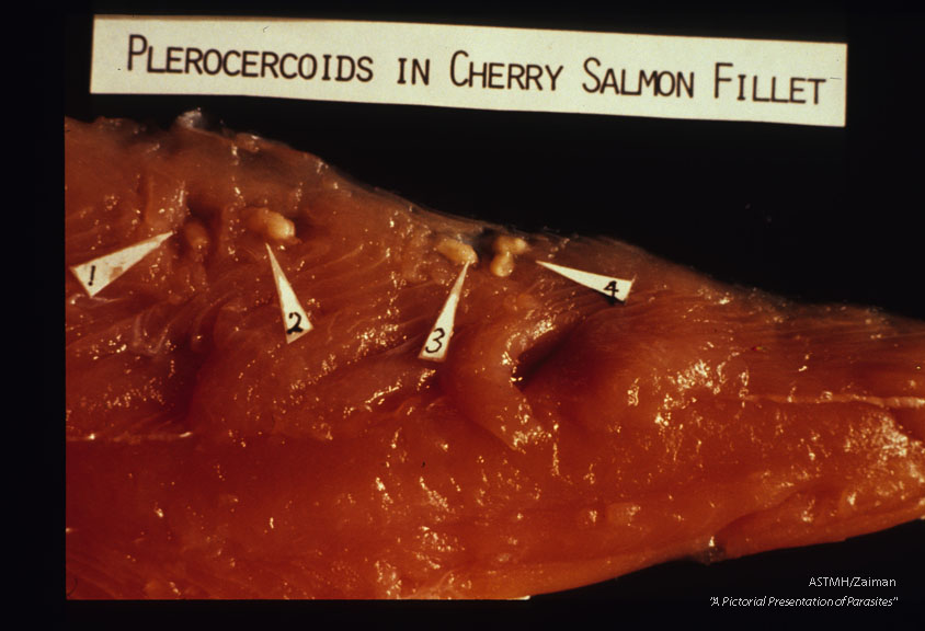 Description: Encysted plerocercoids in cherry salmon fillet.