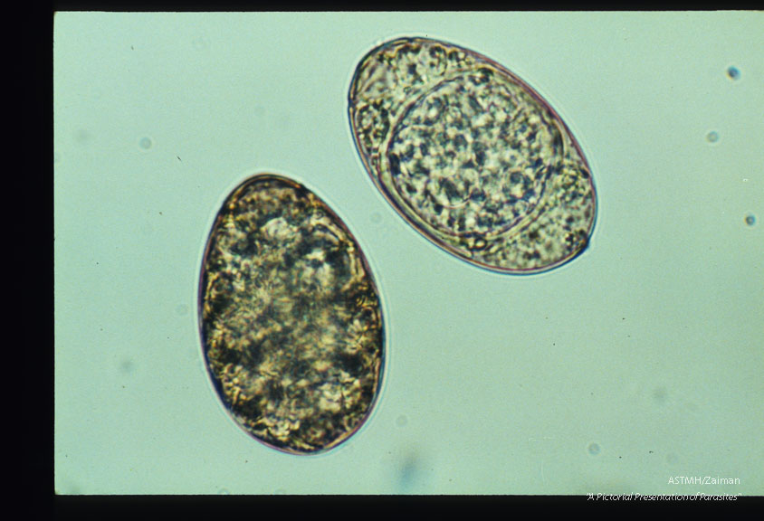 Description: Two eggs, one undeveloped, the other containing a coracidium.