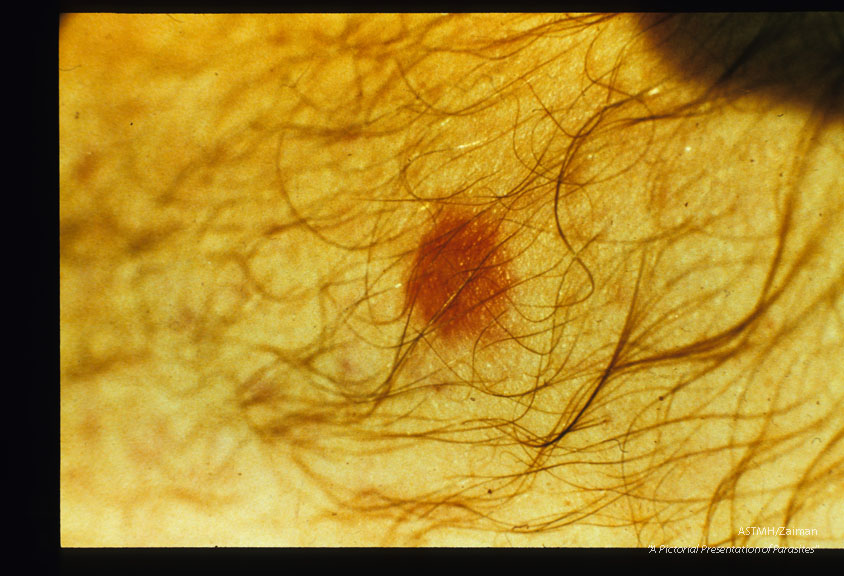 Description: Skin reaction to a chigger bite of the leg (Missouri).