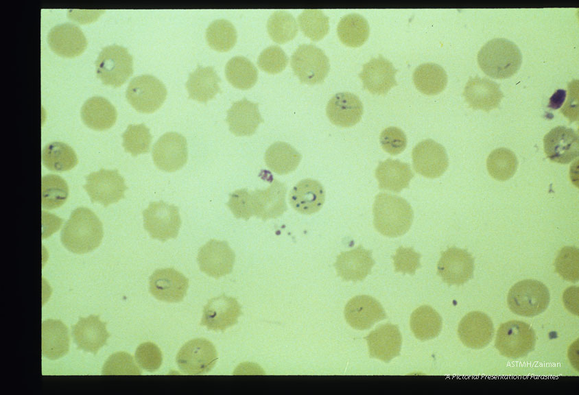 Description: Giemsa stained slides from a fatal case on Fire Island, N. Y., (1982). The parasitemia is high for human babesiosis. Budding, multiply-infected erythrocytes, tetrad formation, band forms, reticulocytosis and clumping of extracellular parasites may be seen.