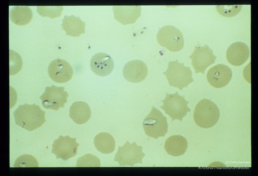 Description: Giemsa stained slides from a fatal case on Fire Island, N. Y., (1982). The parasitemia is high for human babesiosis. Budding, multiply-infected erythrocytes, tetrad formation, band forms, reticulocytosis and clumping of extracellular parasites may be seen.