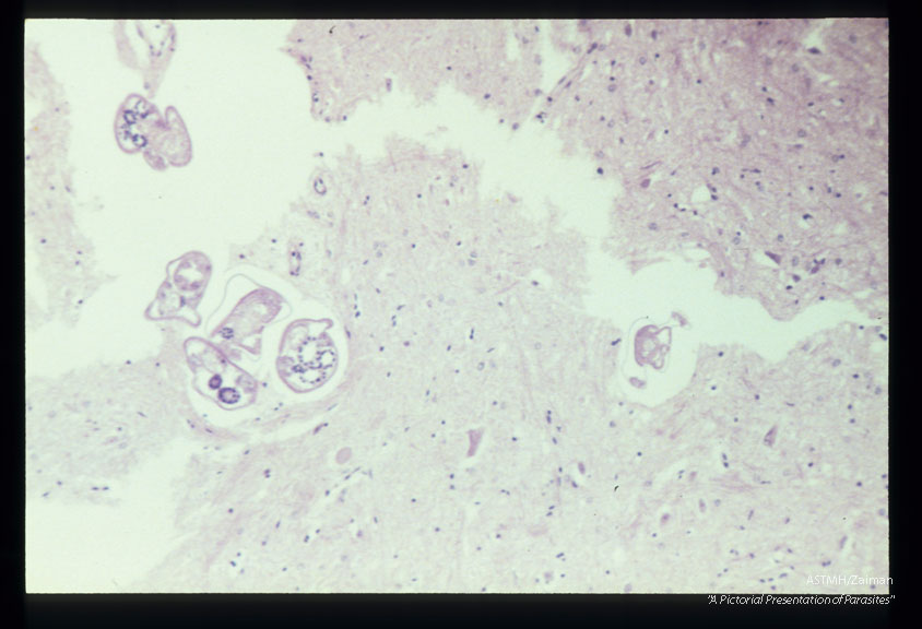 Description: Longitudinal and cross-section of larvae in the spinal cord.