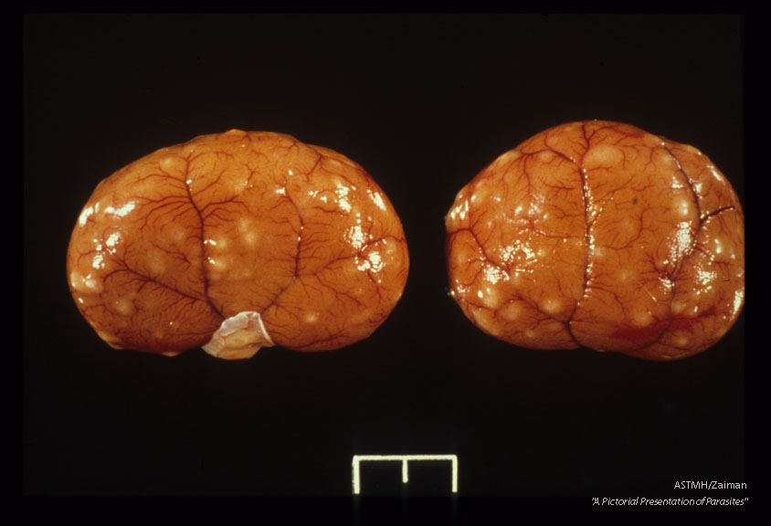 Description: Experimental cat infections. Five thousand infective eggs given per os. Numerous large cortical granulomas on the kidney 36 days after infection.
