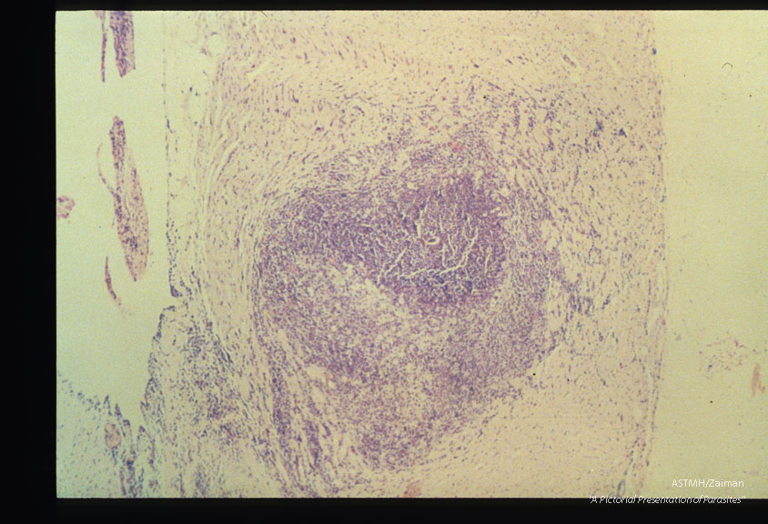 Description: Large eosinophile-rich granuloma occupying almost the entire width of the right ventricular free wall. Naturally infected cat. HE, x 40.