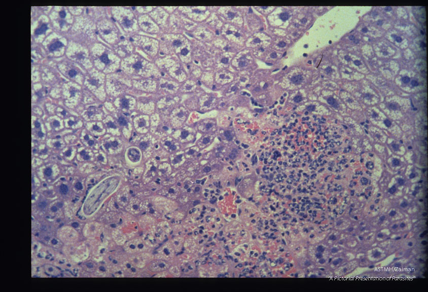 Mouse, BALB/c-Experimental infection as in 1955 Liver. At 48 hours PI this coiled larva, seen in both longitudinal and cross section, is not directly associated with the inflammatory response. HE, x 400.