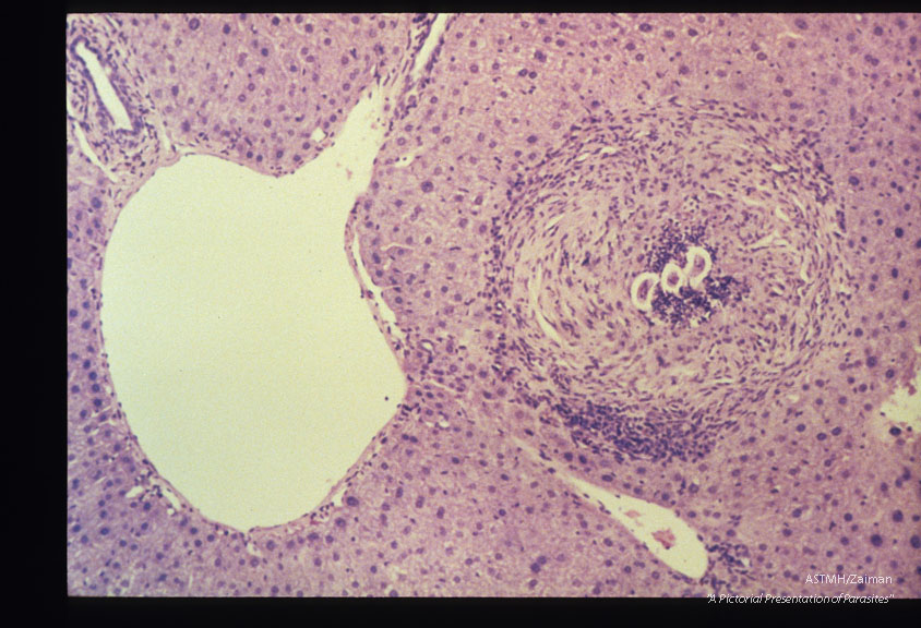 Description: Mouse. BALB/c-Experimental infection, chronic, with 500 infective T. canis eggs per os. Liver. At 8 months PI this coTled larva is present within a large, well-organized fibrotic granuloma. HE, x 100.