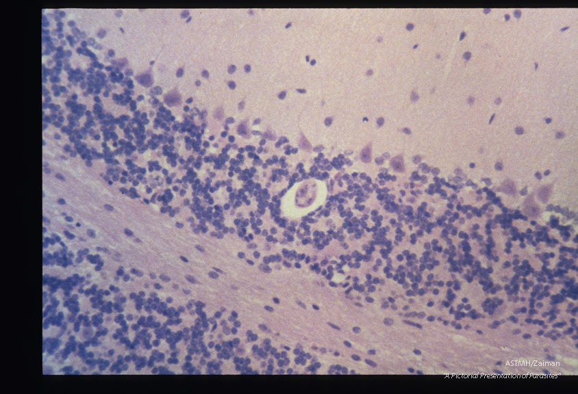 Mouse, BALB/c-Experimental infection as in 1957. CNS. At 8 months PI a larva is present within the granular layer of the cerebellum. Note the lack of inflammatory reaction. HE, x 200.
