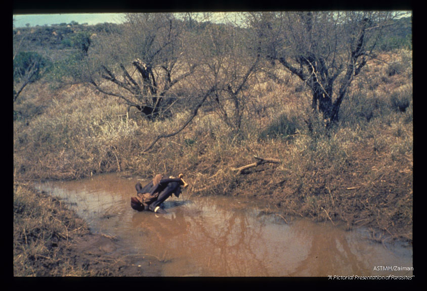 Description: A man drinking polluted water. Ethiopia.