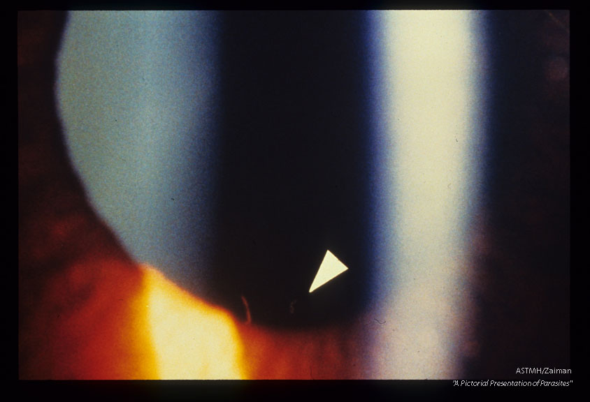 Description: A single microfiliaria is present in the anterior eye chamber of a Liberian male.