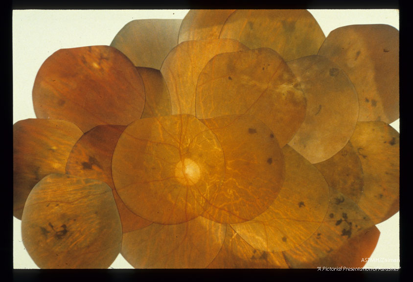 Photographic montage of a 33 year old Ghanian male showing extensive choreuretinal atrophy and some retinal fibrosis.
