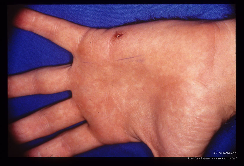Gross views of hand with inplanted nematode in preexisting puncture wound.