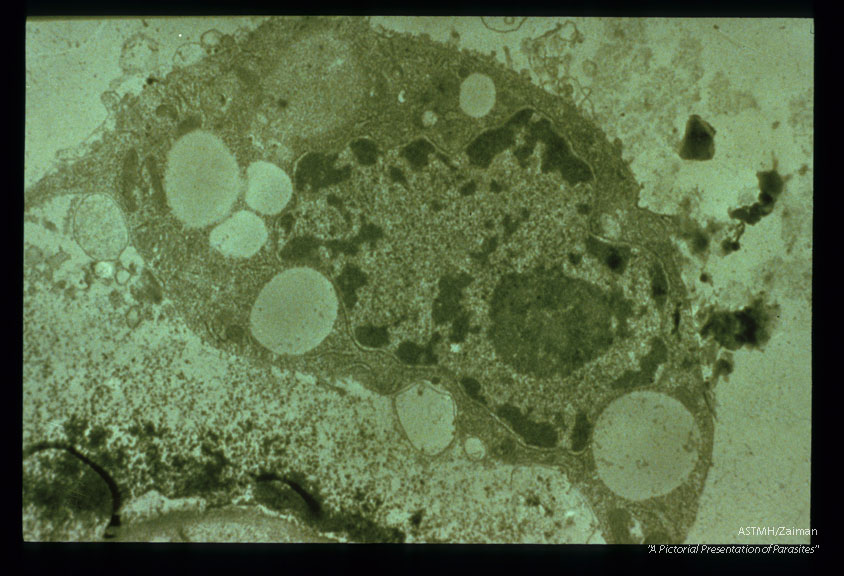 Description: Transmission electron micrograph of a hemocyte during an encapsulation reaction against a microfilaria in A. trivittatus. Note the mf in the lower left corner with melanin deposits on the cuticle.