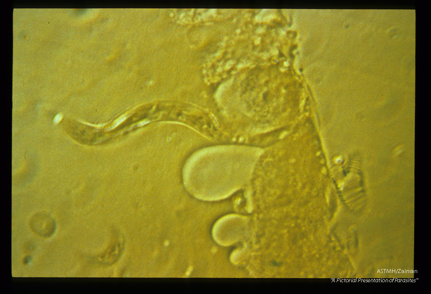 Description: Microfilaria beginning to penetrate the midgut epithelium of Aedes aegypti (interference contrast).