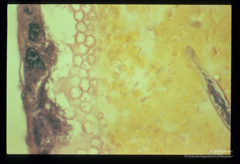 Description: Microfilaria within the blood meal in the midgut of a. aegypti (H 4 E stained section).