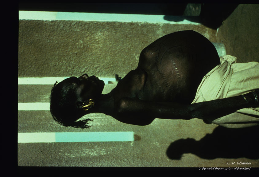 Description: Abdominal distention in a population infected with hydated cysts. In this unusual ecological niche, dogs become infected by eating cysts from infected humans whom they dig out of shallow graves.