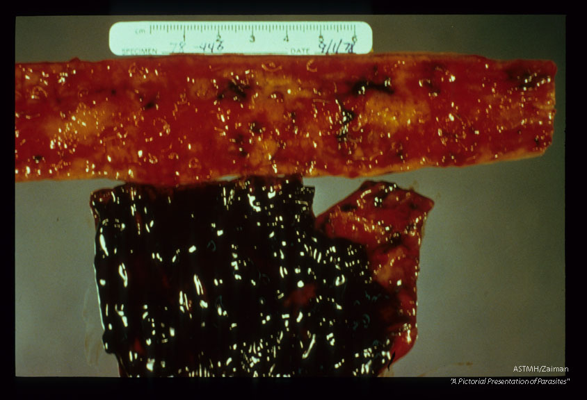 Description: Dog gut showing adults, points of attachment and blood.