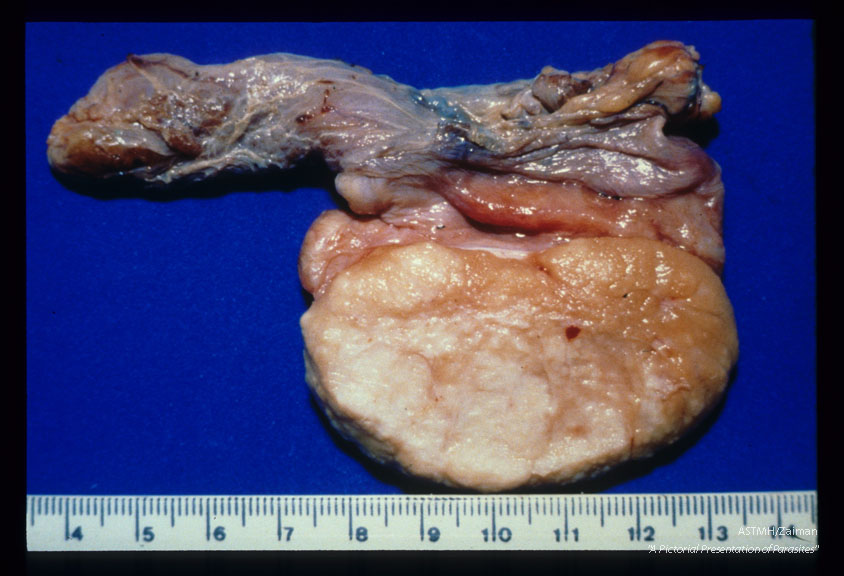Description: Gross and microscopic photos showing granulomatous formations in testicle as well as adult worm in the pampiniform plexus.