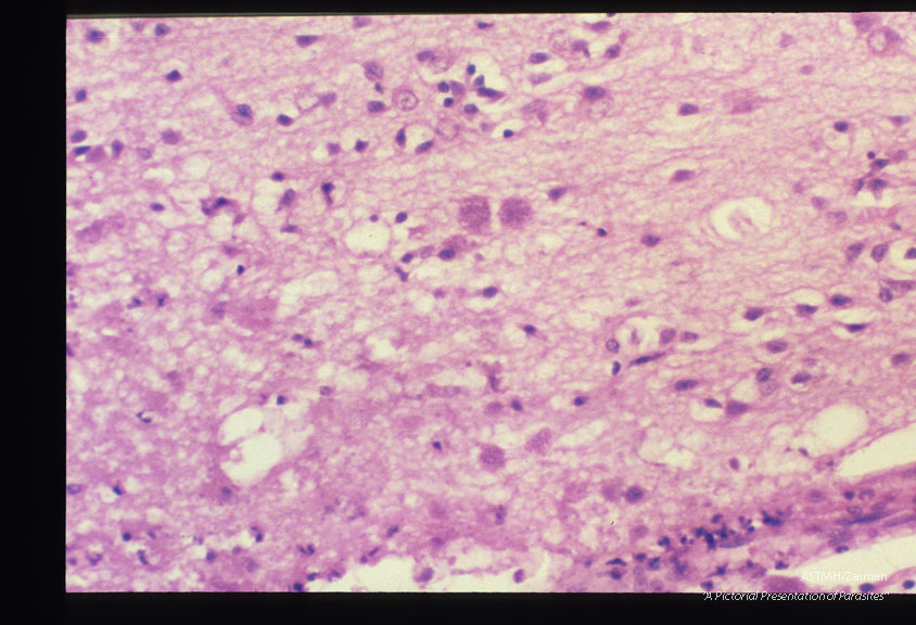 Description: A cardiac recipient received a heart which harbored Toxoplasma and died thereof. Prior to transplantation his serology was negative for Toxoplasma. The parasites are readily visualized in his brain.