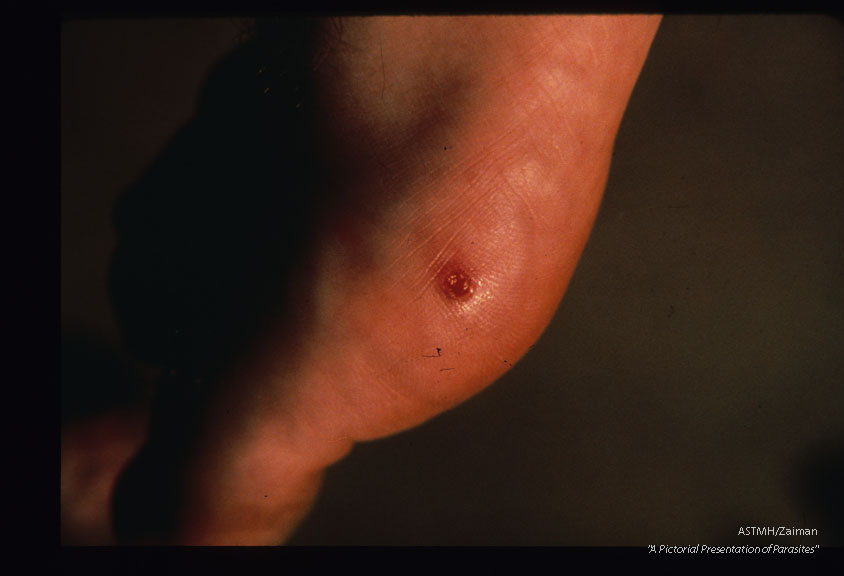 Description: Lesion on the medial aspect of a medical missionary's foot prior to and after extraction (2194) of the flea.
