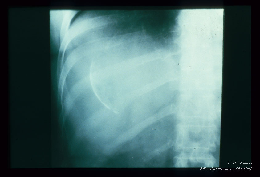 A cyst present in the upper portion of the right lobe of the liver is poorly calcified and presents only as a circumlinear white line.