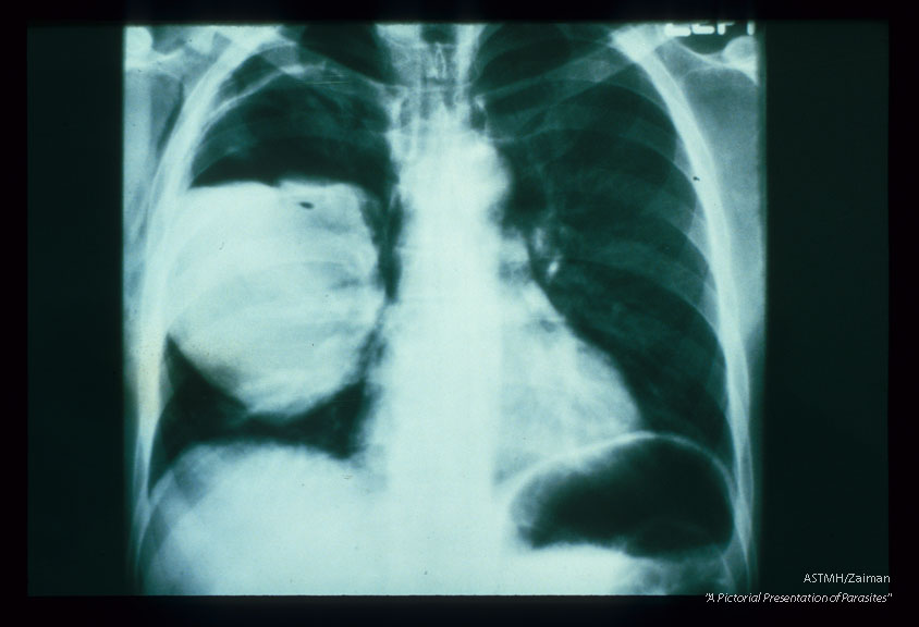 Description: Frontal and lateral chest x-rays. A huge partially empty white cyst is present in the right lung of this patient. It's upper limits are marked by a white pencil-like line of calcium, Above the white fluid and below the white penciled line, the cyst is filled with air (black). This indicates communication between the cyst and a bronchus. Usually an air-fluid interface would be a neat line. In echinococcosis, the line is irregular due to floating collapsed membranes (from the dome of the cyst) and floating daughter cysts. This is the classic floating lily sign of pulmonary echinococcosis.