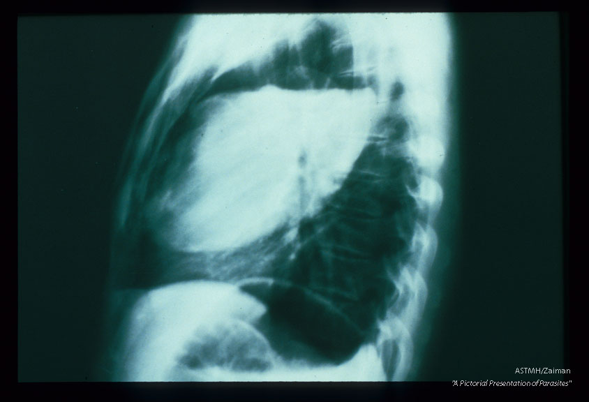 Description: Frontal and lateral chest x-rays. A huge partially empty white cyst is present in the right lung of this patient. It's upper limits are marked by a white pencil-like line of calcium, Above the white fluid and below the white penciled line, the cyst is filled with air (black). This indicates communication between the cyst and a bronchus. Usually an air-fluid interface would be a neat line. In echinococcosis, the line is irregular due to floating collapsed membranes (from the dome of the cyst) and floating daughter cysts. This is the classic floating lily sign of pulmonary echinococcosis.