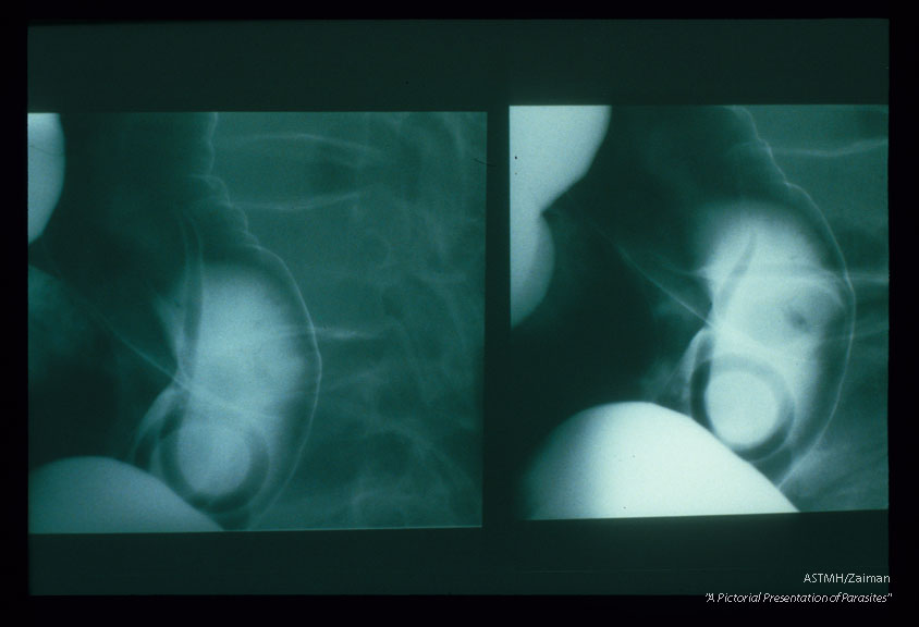 Description: Two spot films from an upper gastro-intestinal barium study. White barium in this small bowel outlines an adult worm which displaces the barium and appears dark.