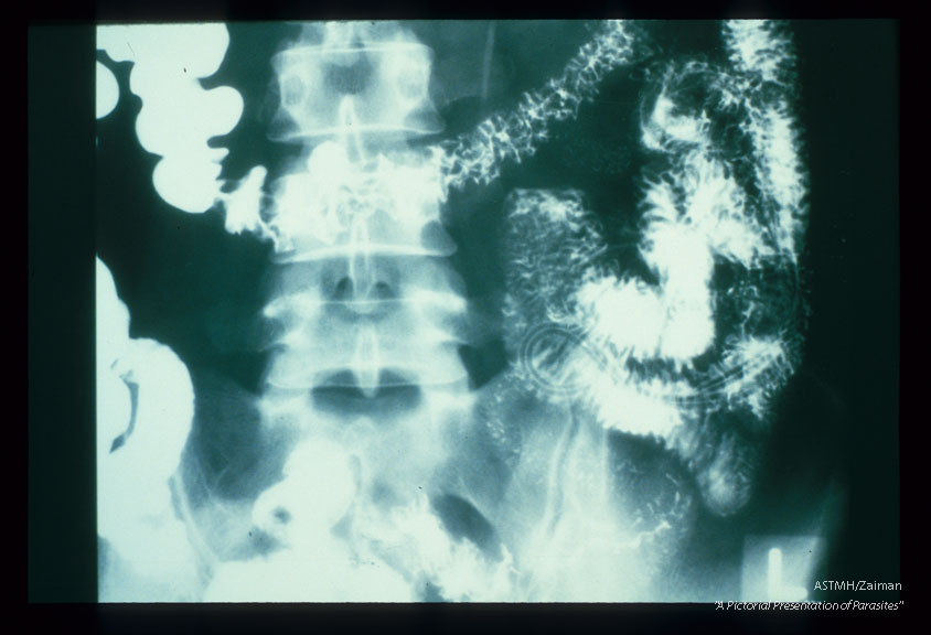 Small bowel barium study shows adult worms which present as longitudinal dark lucencies against the white barium in the small bowel. The worms have ingested the barium. Their guts present as white longitudinal line bisecting the dark lucencies which represent the worm bodies.