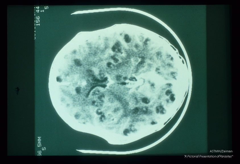 A CAT scan of the skull shows multiple small, rounded, dark lucencies in the brain. These are cysticerci. Some show central, white calcific dots which are scolices. Some show peripheral calcifications. Midline bird-like and linear dark lucencies represent the ventricular system. Midline white calcific densities are probably vascular structures.