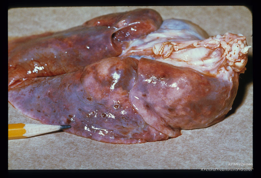 Description: Perforation of the lung (at the pencil tip) several days after worms reach the pleural cavity.