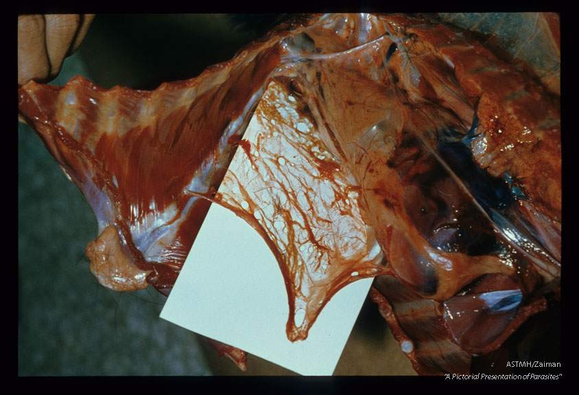 Description: Perforations are present in the mesentery due to migration of pre-adult Paragonimus several weeks after infection.