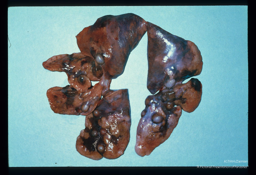 Description: Massive infection showing numerous pulmonary cysts containing adult Paragonimus in a cat exposed to 200 parasites.