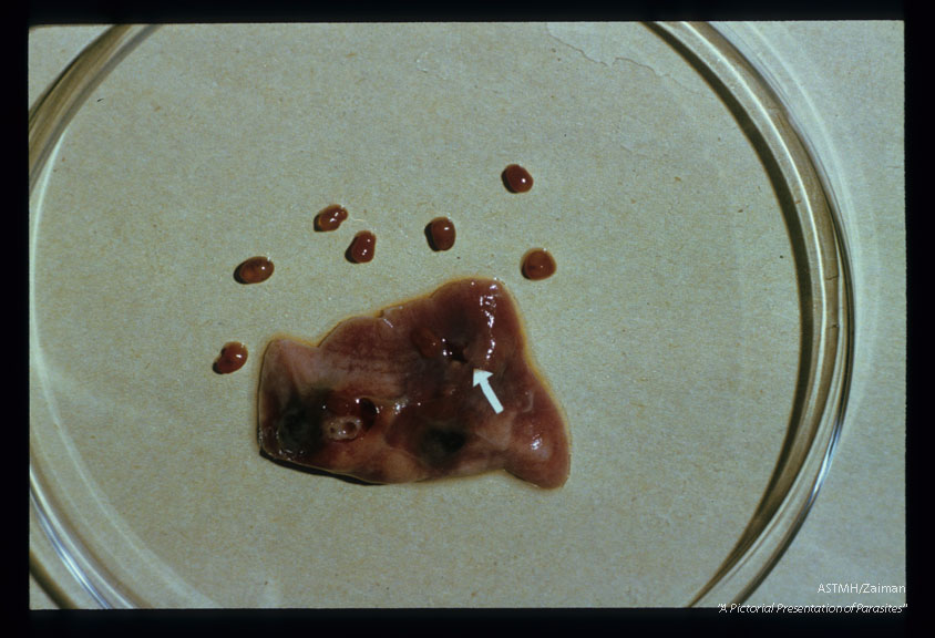 Adult worms separated from a cat lung. A ruptured cyst on the surface of the lung is marked by an arrow.