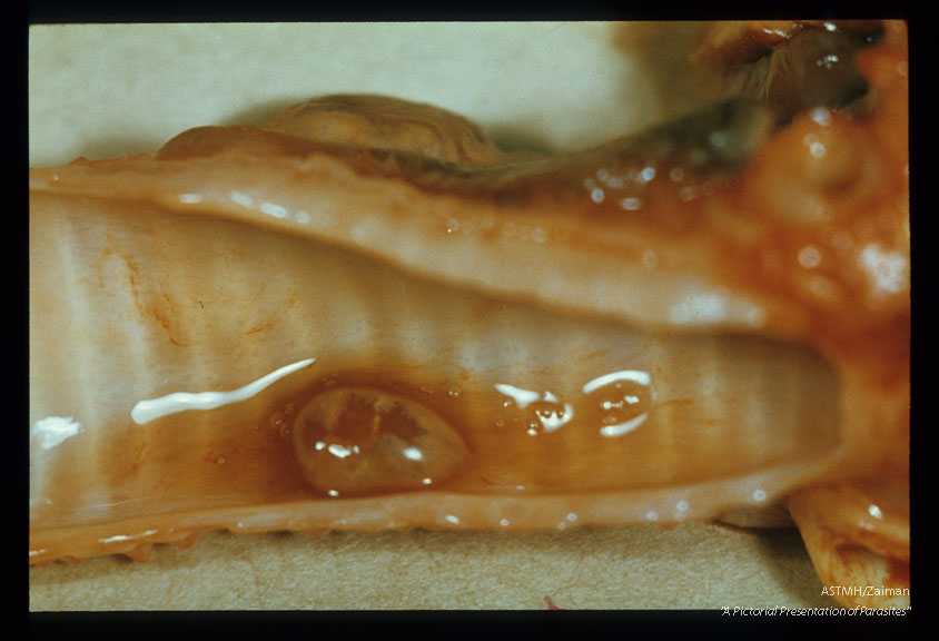 Adults may occasionally migrate. An adult worm is present in the trachea of this dog.