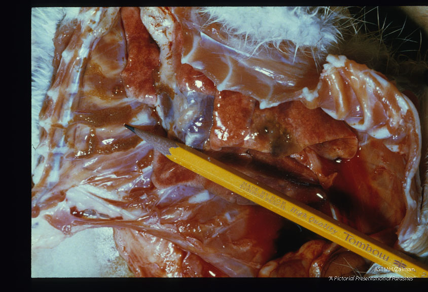 Huge deposits of parasite eggs (pencil tip) are present on the pleura. At the higher magnification, two migrating adult worms are visible.
